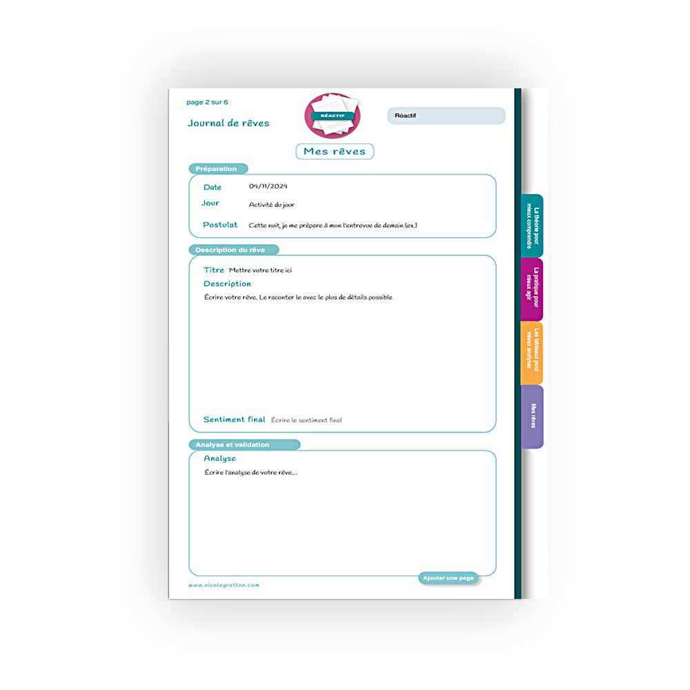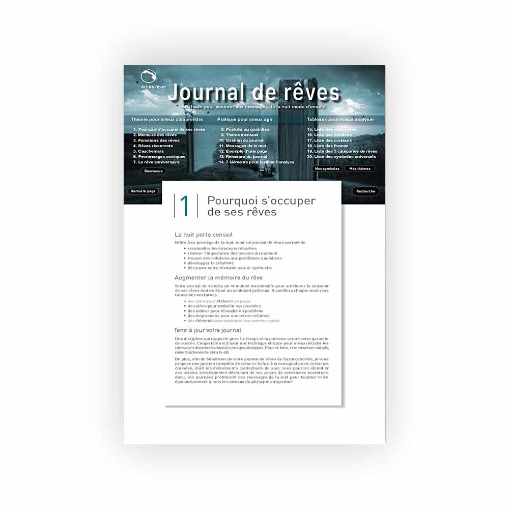 Voici une application (PDF interactif) qui se veut un outil simple et original qui permet de noter vos rêves à l’ordinateur. Vous aurez du plaisir à explorer le contenu de vos aventures nocturnes et à en tirer profit. En tenant compte des multiples messages contenus dans vos rêves, ce journal électronique deviendra le fidèle complice non seulement de vos nuits, mais également de votre vie. Il possède un engin de recherche pour retrouver rapidement vos rêves importants. Il permet aussi de constituer votre propre dictionnaire de symboles personnels et de définir vos thèmes mensuels. Il inclut la méthode développée par Nicole Gratton pour améliorer la mémoire de vos songes et déceler les éléments clés.